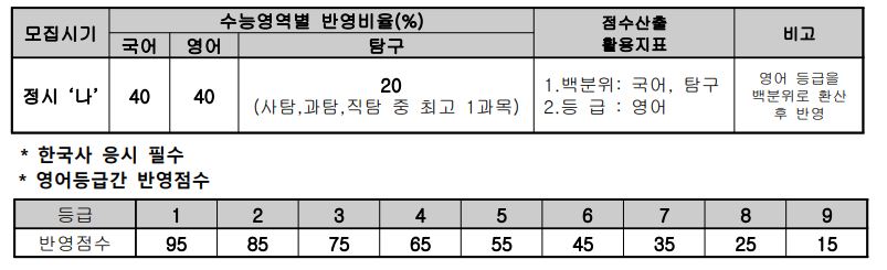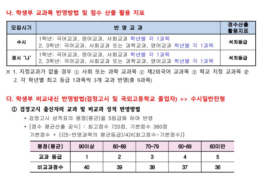 수시에서 교과를 반영할 때에는 1학년 국영사 중 학년별 각 1과목, 2~3학년에서는 국사 또는 과영 학년별 각 1과목을 반영합니다. 정시 역시 동일합니다.
