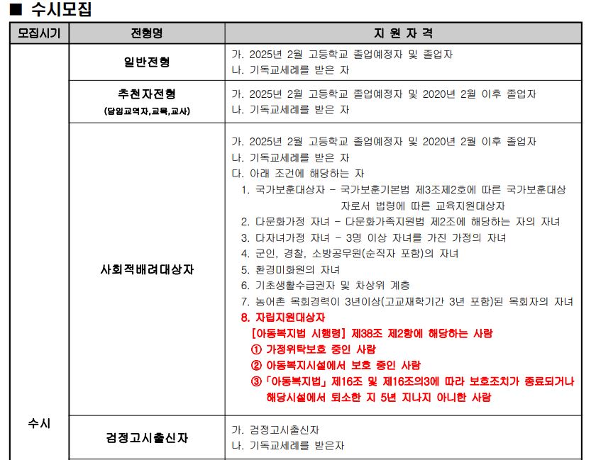 수시 사회적배려대상자전형에서는 국가보훈대상자, 다문화가정 자녀, 다자녀가정 자녀(3명), 군인, 경찰, 소방공무원(순직자 포함)의 자녀, 환경미화원의 자녀, 기초생활수급권자 및 차상위 계층, 농어촌 목회경력이 3년이상 된 목회자의 자녀, 자립지원대상자를 신입생으로 모집하고 있으며,