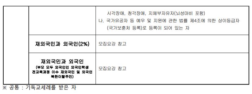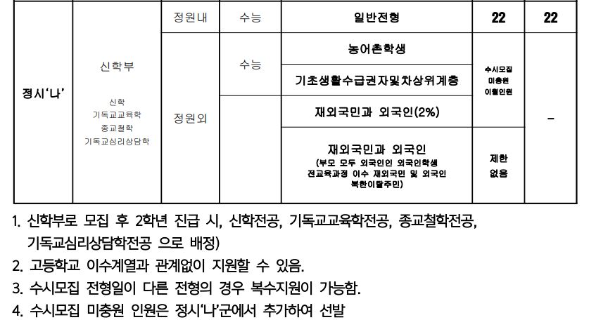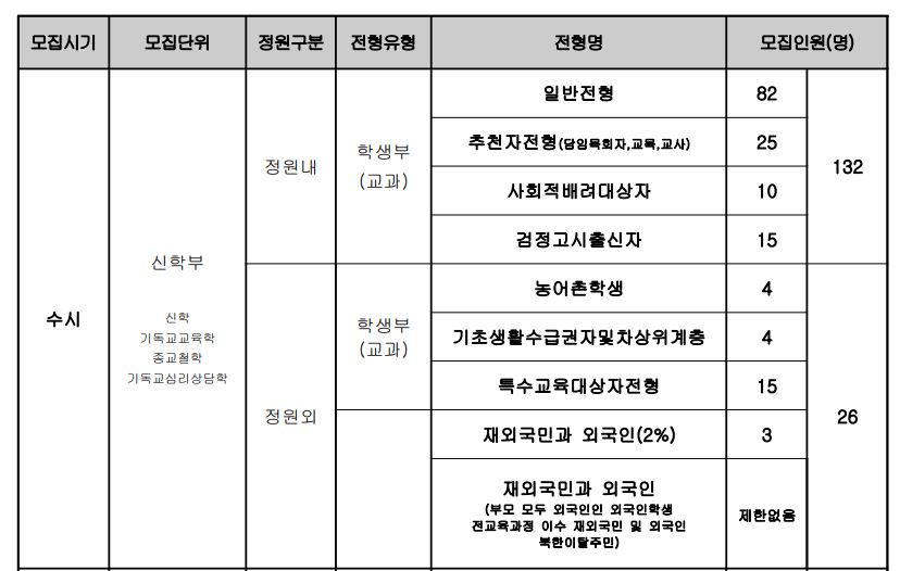 감리교신학대학교는 모든 전형에서 기독교세례를 받은 자만 모집을 하고 있습니다. 일반전형 역시 동일하니 유념하시기 바랍니다.