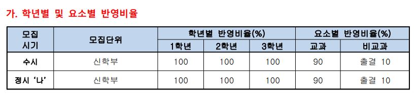 학생부 반영을 할 때 학년별 가중치는 없으며, 교과 90% + 비교과(출결) 10%로 학생을 모집할 예정입니다.