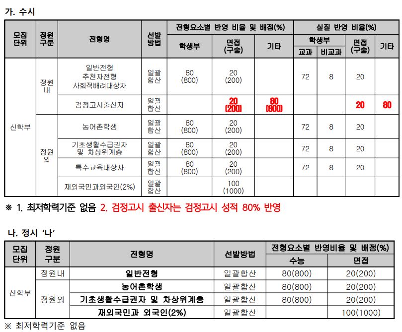 재외국민과외국인(2%)는 면접(구술) 100%로 학생을 모집합니다. 정시도 비슷하게 비율을 적용합니다.