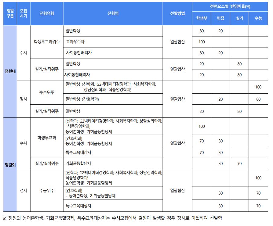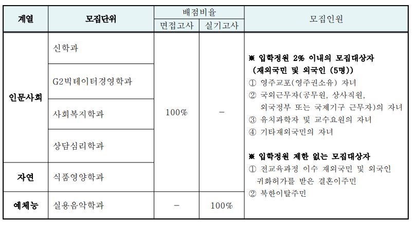 신학과, G2빅데이터경영학과, 사회복지학과, 상담심리학과, AI기반경영학과, 식품영양학과, AI빅데이터융합학과는 면접고사 100%로, 실용음악학과와 음악학과는 실기고사 100%로 학생을 모집합니다.