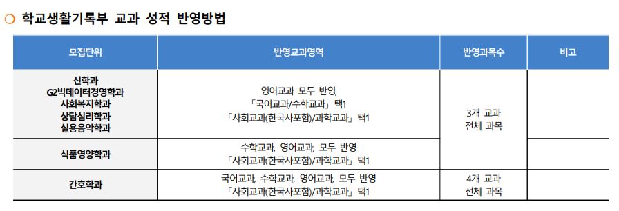신학과, G2빅데이터경영학과, 사회복지학과, 상담심리학과, 실용음악학과는 3개 교과 전체 과목을 반영하며, 영어교과는 필수로 반영하며 국어교과/수학교과 택1, 사회교과(한국사포함)/과학교과 택1로 반영합니다. 식품영양학과의 경우 수학교과, 영어교과를 모두 반영하고 사회교과(한국사포함)/과학교과 택1로 반영합니다.