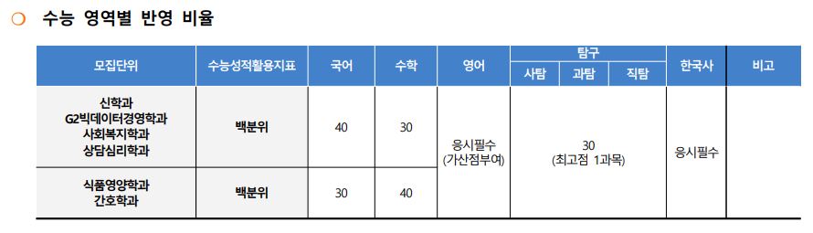 간호학과는 국어 수학 영어 모두 반영하고, 사회교과(한국사포함)/과학교과 택1 후 4개 교과 전체 과목을 반영합니다.