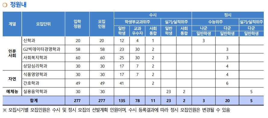 정원내 모집인원은 다음과 같습니다. 신학과, G2빅데이터경영학과, 사회복지학과, 상담심리학과, 식품영양학과, 간호학과, 실용음악학과의 신입생을 모집할 예정입니다.