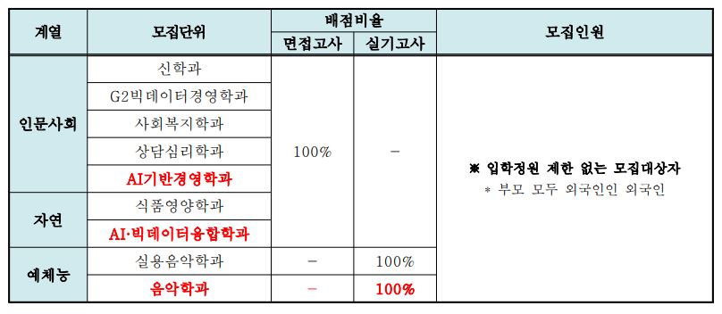 '부모 모두 외국인인 외국인' 전형은 입학정원에 제한이 없습니다. 또한, 일반학생들 대상으로는 모집하지 않는 학과의 신입생도 모집하고 있습니다. AI기반경영학과, AI빅데이터융합학과, 음악학과가 그 대상입니다.