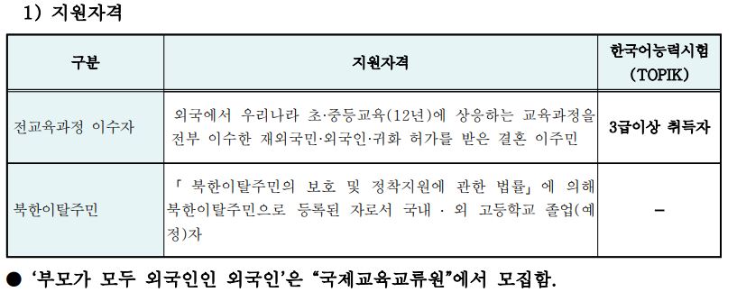 재외국민 및 외국인 전형으로 지원이 가능한 학생은 영주교포(영주권소유) 자녀, 국외근무자(공무원, 상사직원, 외국정부 또는 국제기구 근무자)의 자녀, 유치과학자 및 교수요원의 자녀, 기타재외국민의 자녀여야 하며,