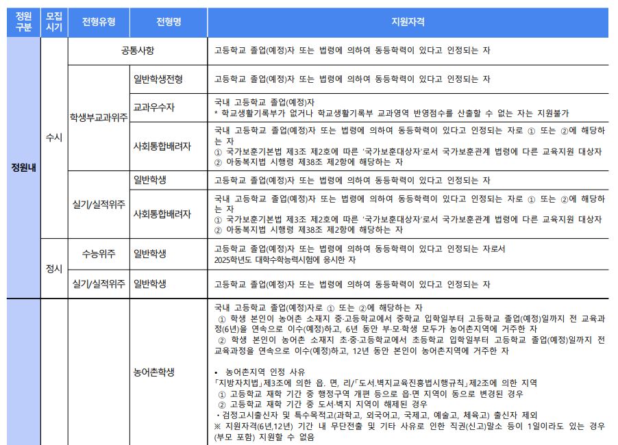 입학정원 제한이 없는 모집대상자는 전교육과정 이수 재외국민 및 외국인 귀화허가를 받은 결혼이주민, 북한이탈주민입니다.