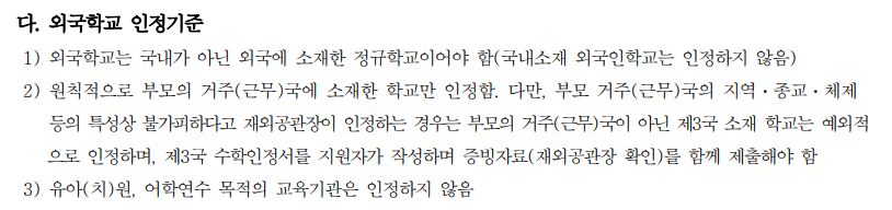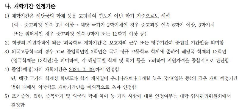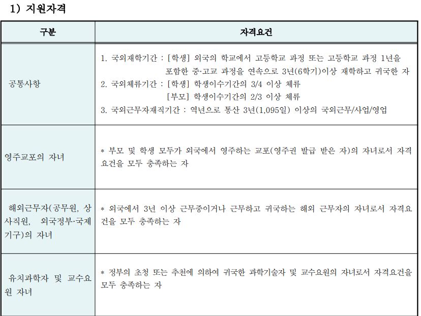 앞서 대상자의 조건에 대해 언급을 했는데요, 공통적으로 학생이 외국의 학교에서 고등학교 과정 또는 고등학교 과정 1년을 포함한 중고교 과정을 연속으로 3년(6학기)이상 재학하고 귀국한 자여야 하며, 학생은 학생이수기간의 3/4 이상을, 부모는 학생이수기간의 2/3 이상을 체류했어야 합니다.