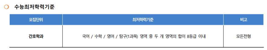 간호학과는 모든전형에서 최저학력기준이 있는데, 국어 / 수학 / 영어 / 탐구(1과목) 영역 중 두 개 영역의 합이 8등급 이내여야 합니다.