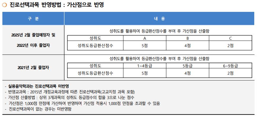 실용음악학과는 진로선택과목을 반영하지 않으며, 가산점을 산출할 때에는 상위 3개과목 성취도 등급점수의 합을 3으로 나누어 진행합니다. 만약 진로선택과목이 없다면, 미반영합니다. 가산점 계산 방법은 위와 같습니다.