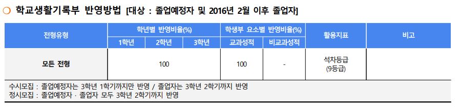 수시, 정시 모두 2016년 이전(포함) 졸업자, 일반계고교직업과정 위탁생, 공업계 2+1 체제 이수자, 검정고시, 외국의 고등학교 과정 이수자, 교과교육 소년원의 고교과정 이수자는 비교내신을 적용하여 반영합니다.