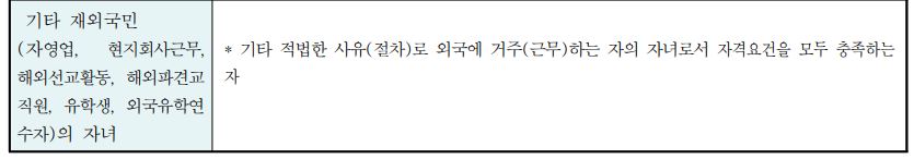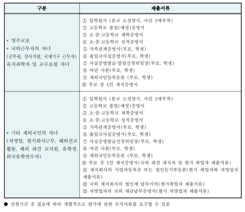 재외국민 및 외국인 전형으로 지원이 가능한 학생은 영주교포(영주권소유) 자녀, 국외근무자(공무원, 상사직원, 외국정부 또는 국제기구 근무자)의 자녀, 유치과학자 및 교수요원의 자녀, 기타재외국민의 자녀여야 하며,