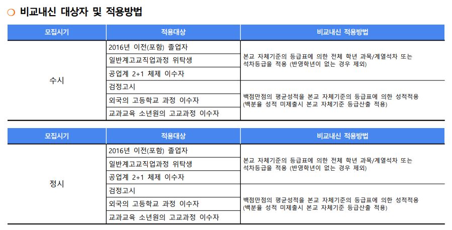 수시, 정시 모두 2016년 이전(포함) 졸업자, 일반계고교직업과정 위탁생, 공업계 2+1 체제 이수자, 검정고시, 외국의 고등학교 과정 이수자, 교과교육 소년원의 고교과정 이수자는 비교내신을 적용하여 반영합니다.