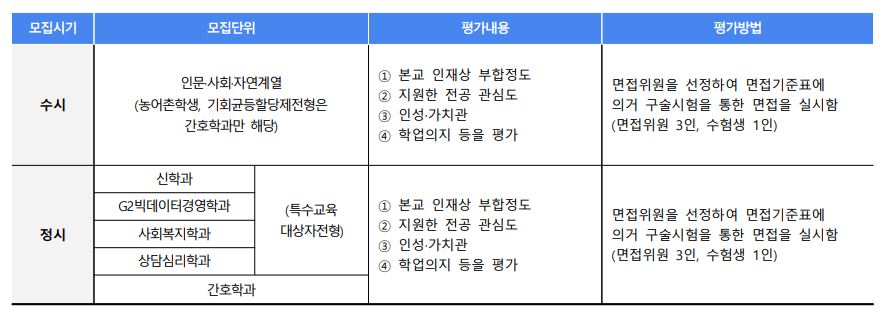 신학과, G2빅데이터경영학과, 사회복지학과, 상담심리학과, AI기반경영학과, 식품영양학과, AI빅데이터융합학과는 면접고사 100%로, 실용음악학과와 음악학과는 실기고사 100%로 학생을 모집합니다.