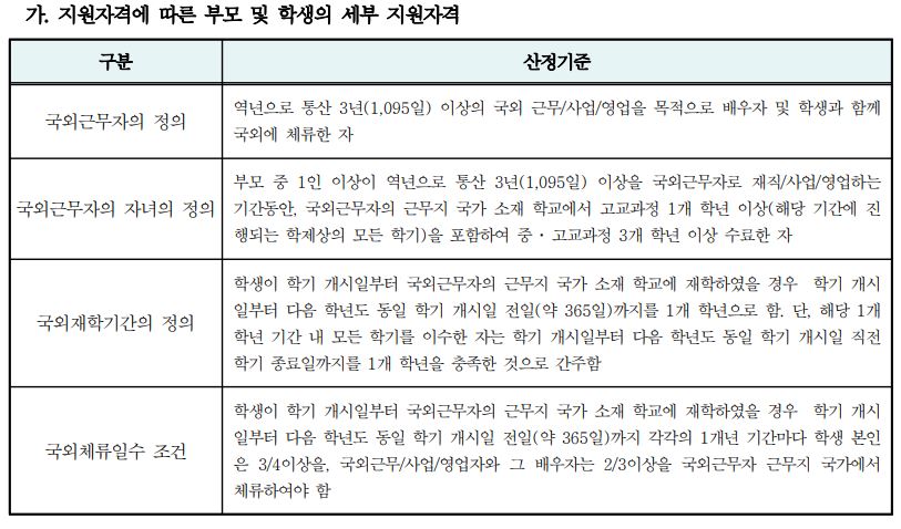 1. 지원자격에 따른 부모 및 학생의 세부 지원자격