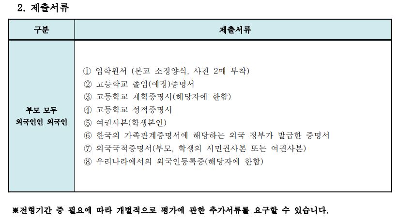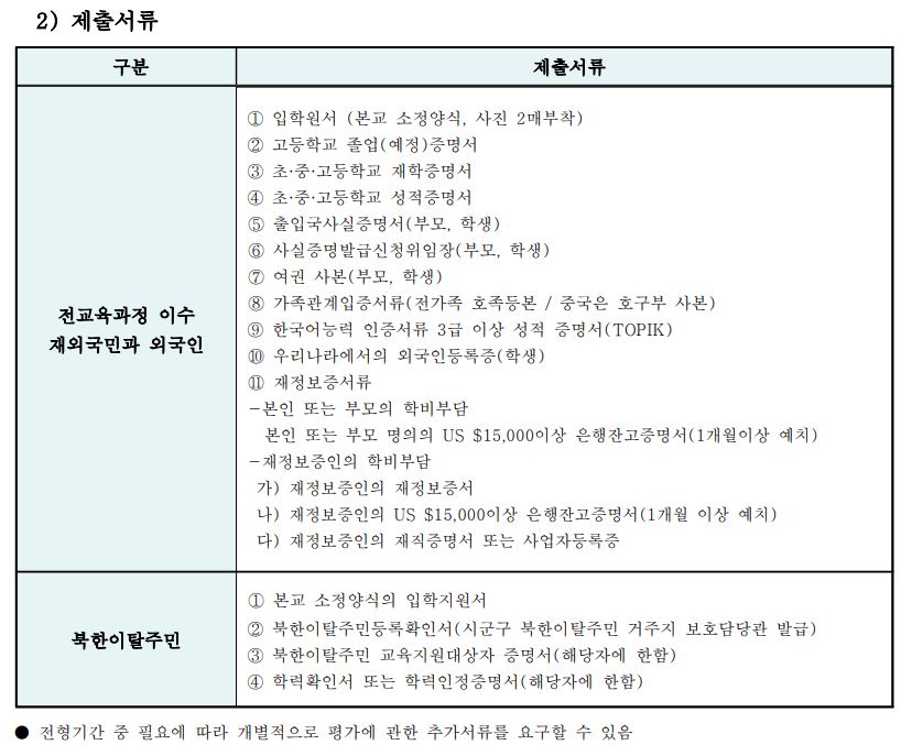 전교육과정 이수 재외국민과 외국인 전형의 경우, 재정보증서류가 필요합니다.