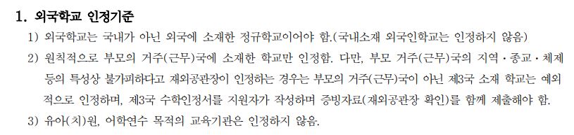 앞서 대상자의 조건에 대해 언급을 했는데요, 공통적으로 학생이 외국의 학교에서 고등학교 과정 또는 고등학교 과정 1년을 포함한 중고교 과정을 연속으로 3년(6학기)이상 재학하고 귀국한 자여야 하며, 학생은 학생이수기간의 3/4 이상을, 부모는 학생이수기간의 2/3 이상을 체류했어야 합니다.