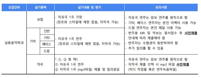 실용음악학과는 실기고사를 실시합니다. 보컬은 자유곡 1곡을 가창해야 하며, 장르와 스타일에는 제한이 없으며, 자작곡도 가능합니다.