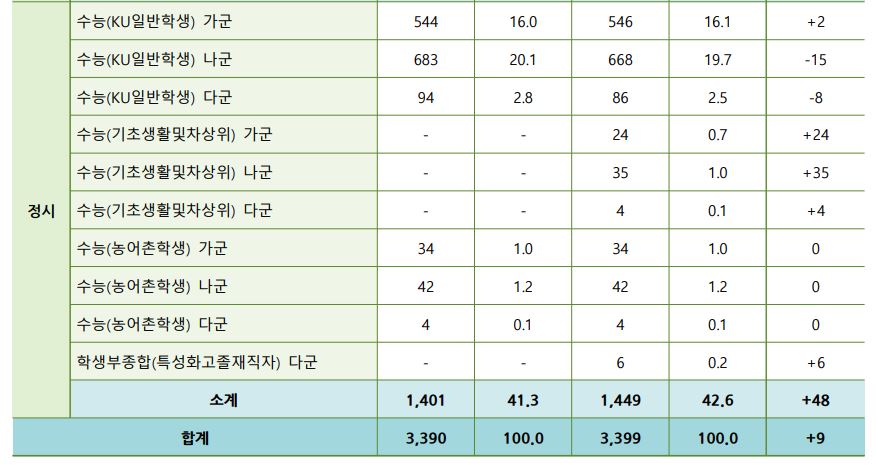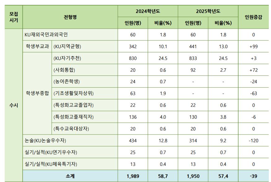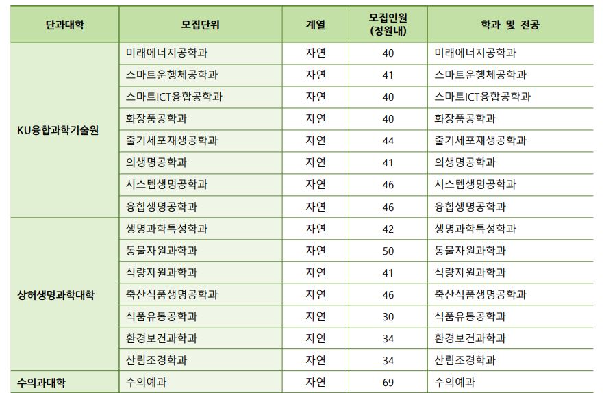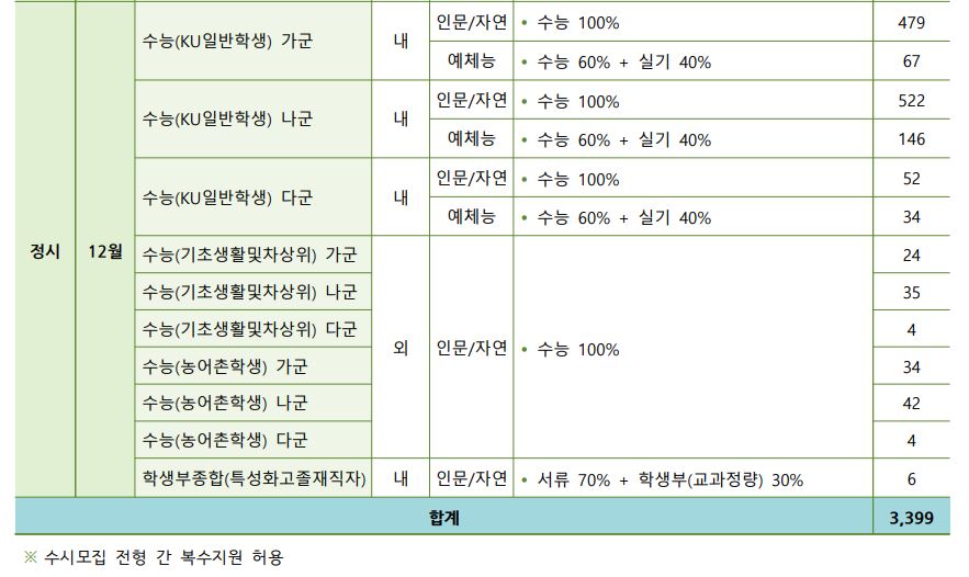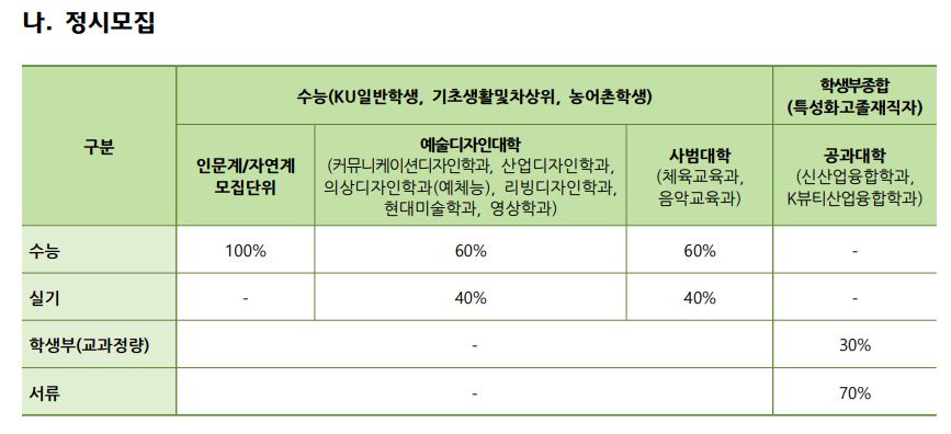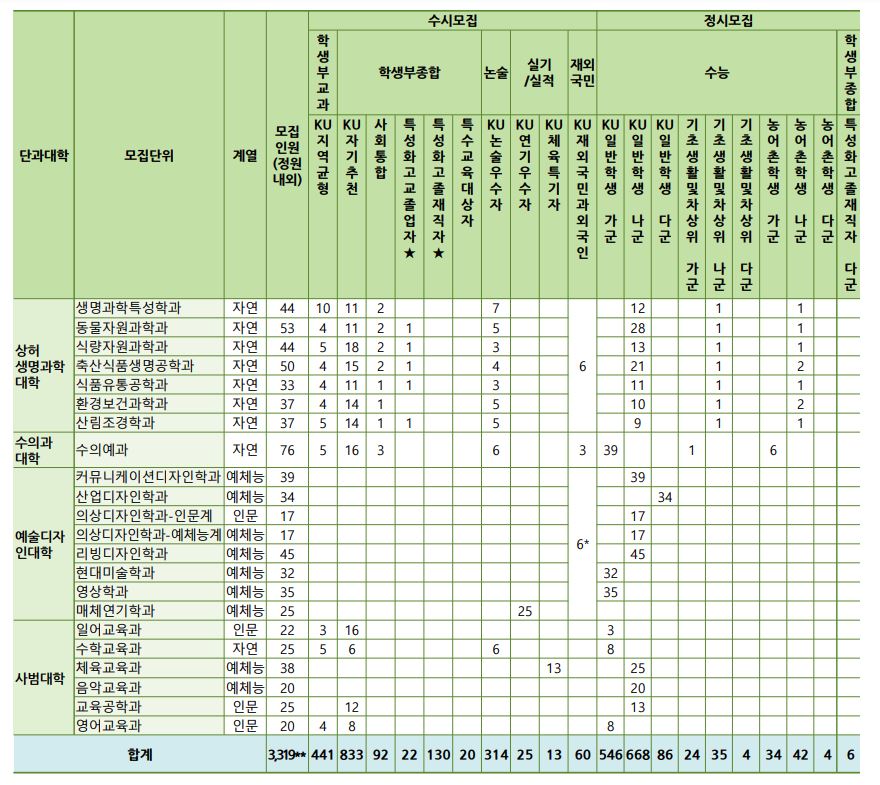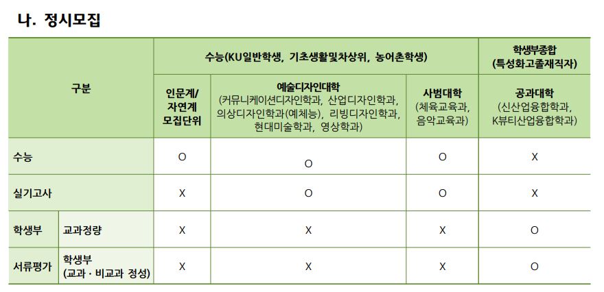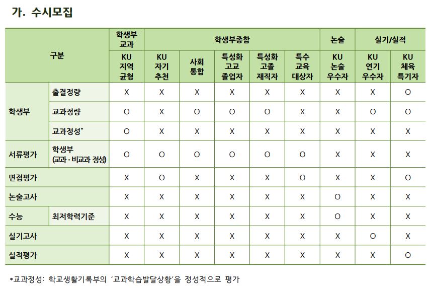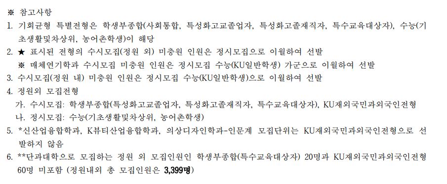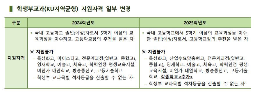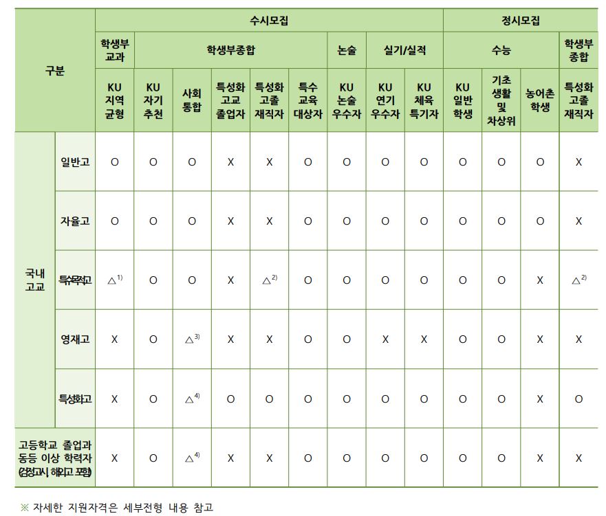 글고 학생부교과(KU지역균형) 지원자격이 일부 변경되었는데요, <각종학교>가 추가되었으며 이 부분은 뒷 내용이나 수시 모집요강이 나와봐야 정확히 알 것 같습니다.
