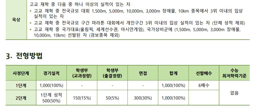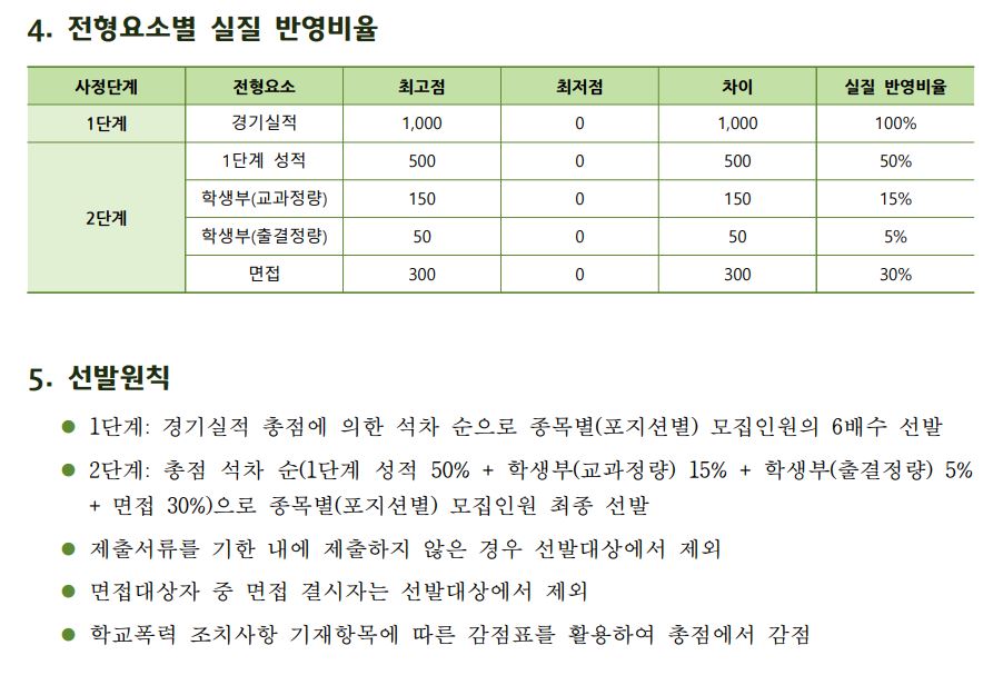 1단계에서 경기 실적 100%로 6배수를 선발하고, 이후 2단계에서 1단계 성적 50% + 학생부 교과정량 15% + 학생부 출결정량 5% + 면접 30%를 반영하여 학생을 모집합니다.