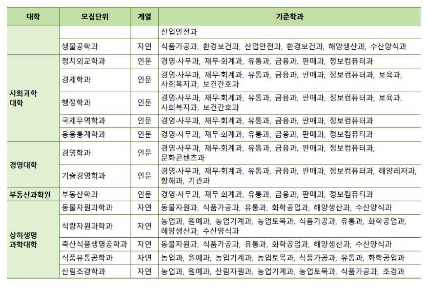 특성화고교졸업자는 동일계열을 이수해야 하며, 기준학과는 위와 같습니다.