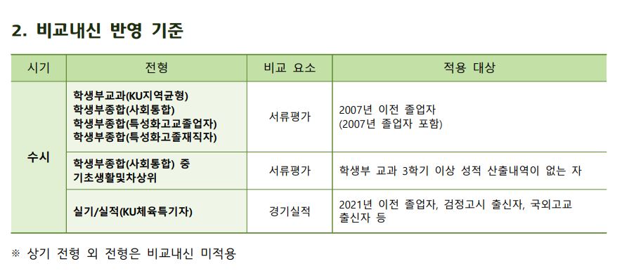 비교내신 적용 대상은 2007년 이전 졸업자, 학생부 교과 3학기 이상 성적 산출내역이 없는 자, 2021년 이전 졸업자, 검정고시 출신자, 국외고교출신자 등입니다. 위에 적혀있는 전형 외에는 비교내신을 적용하지 않습니다.