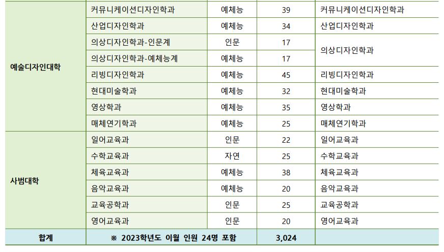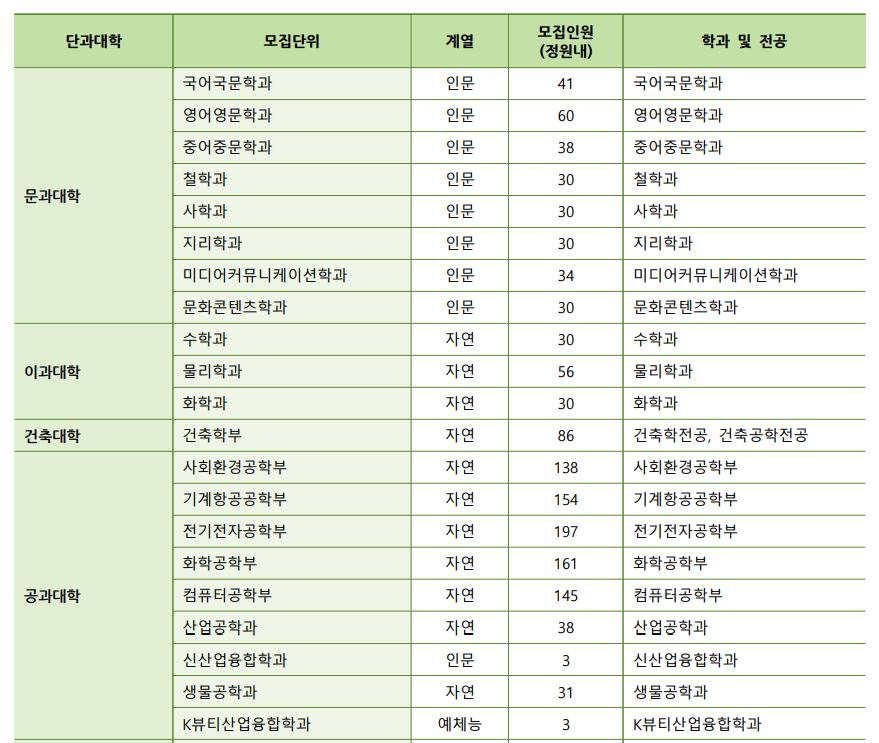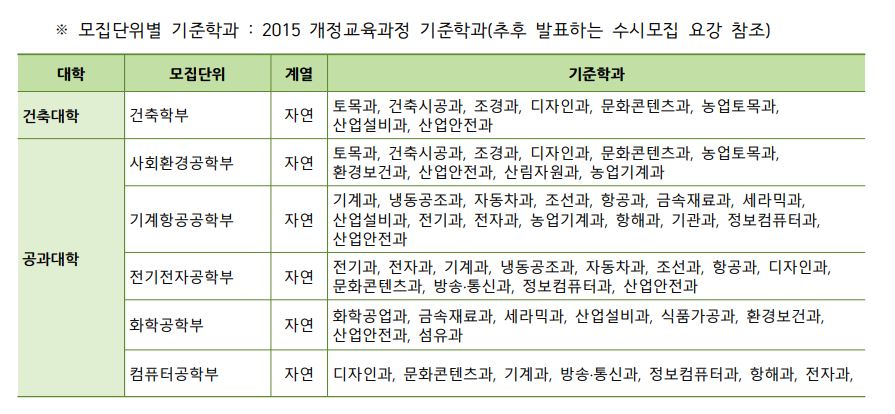 인문, 자연, 예체능에서 올해부터는 언어중심, 수리중심, 예체능으로 변경되었으며, 모집단위는 위와 같습니다.