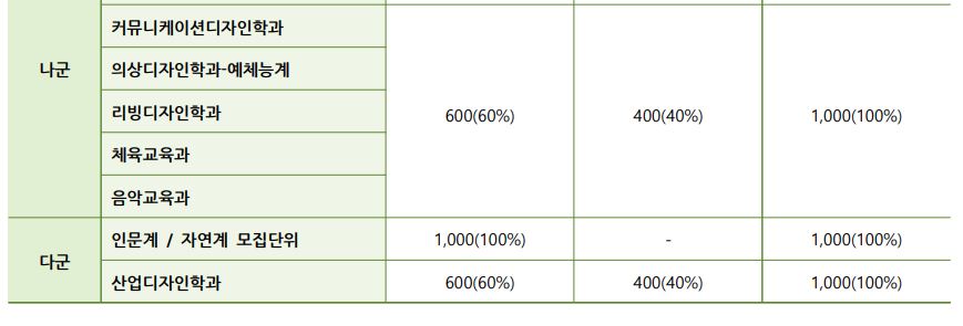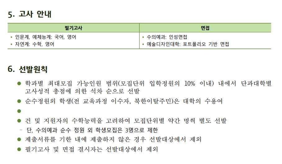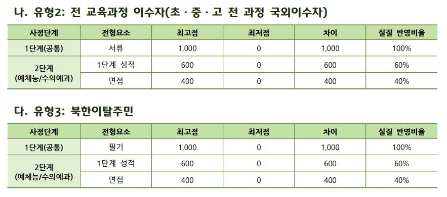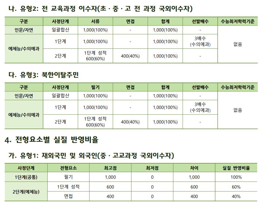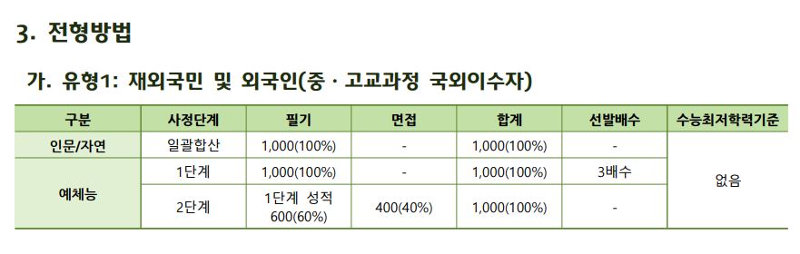 재외국민 및 외국인은 인문/자연에서 필기 100%로, 예체능은 필기 100%로 3배수 학생을 선발한 후에 2단계에서 성적 60% + 면접 40%로 학생을 선발합니다.