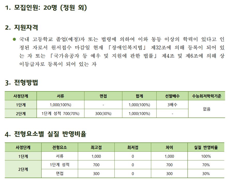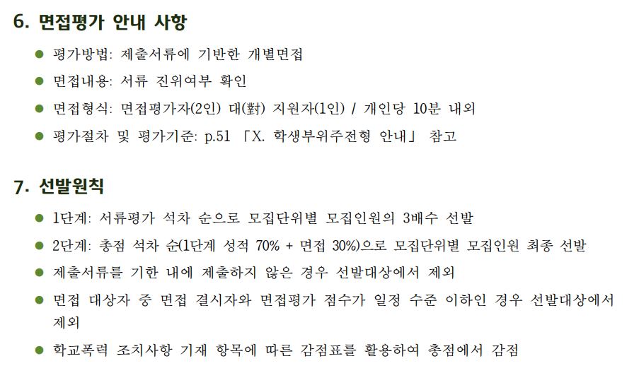 특수교육대상자 전형은 서류 70%, 면접 30%를 반영하여 학생을 모집합니다.1단계에서는 서류로 3배수를 선발하고 이후 2단계에서 면접을 실시합니다.