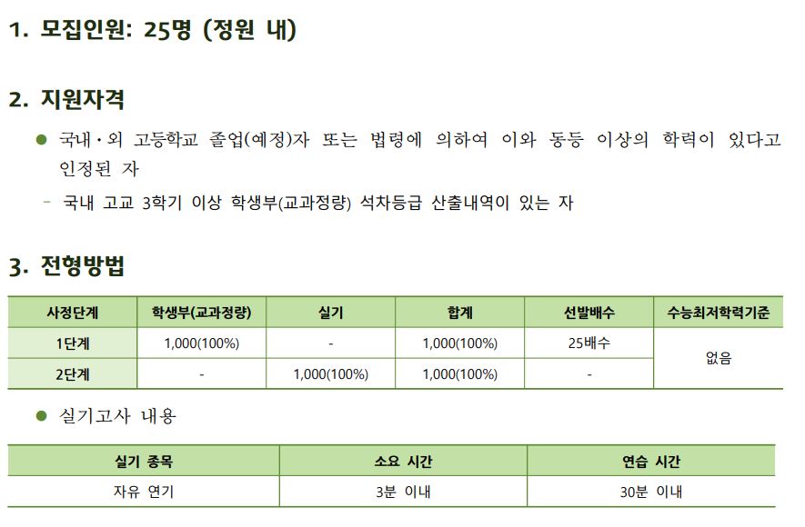 KU연기우수자는 1단계에서 교과정량을 100%로 25배수를 선발하고, 2단계에서 실기 100%로 학생을 선발합니다.