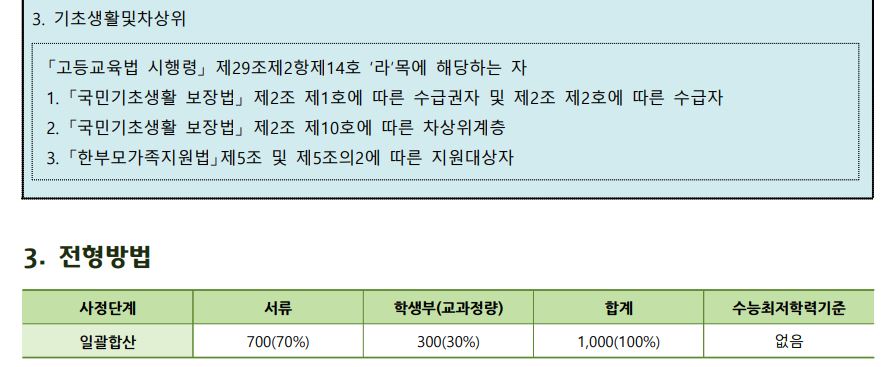 사회통합 전형은 국가보훈대상자, 농어촌학생, 기초생활및차상위 학생이 지원 가능하며 서류 70% + 교과정량 30%로 학생을 선발합니다. 최저학력기준은 따로 없습니다.