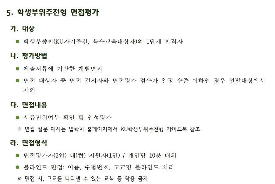 KU자기추천 전형은 면접이 있습니다. 1단계에서는 서류 100%로 3배수를 선발하고, 2단계에서 1단계 서류 70% + 면접 30%를 합쳐 학생을 모집합니다.