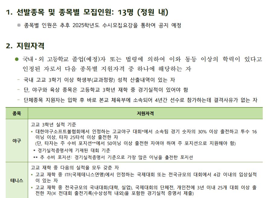 KU체육특기자는 13명을 모집하며, 야구, 테니스, 육상 분야로 모집합니다. 야구는 고교 3학년 실적 기준으로 평가하며, 테니스와 육상은 고교 재학중이 기준입니다.