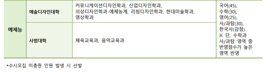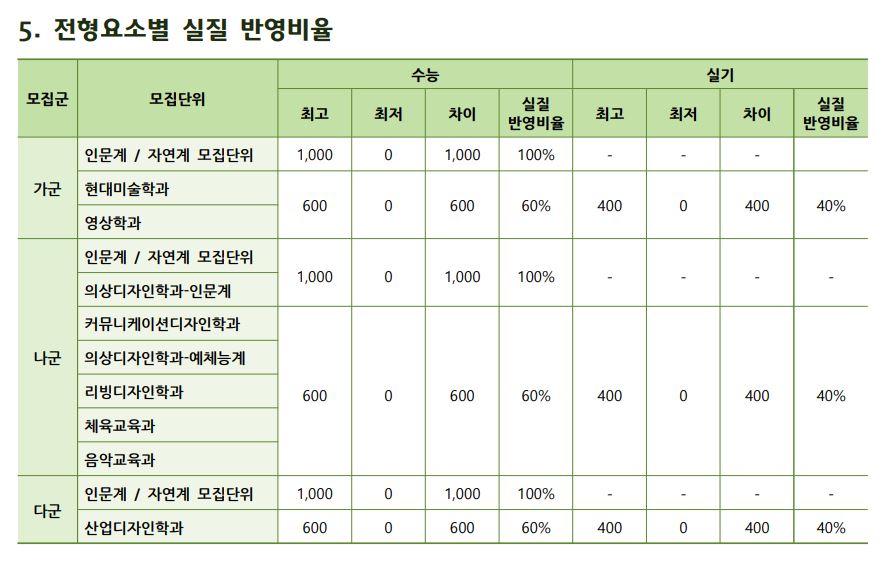 언어중심에서 수학 반영비율이 5% 늘고 사/과탐 반영 비율이 5% 줄었으며, 수리중심 역시 동일합니다. 예체능은 작년에 1,2로 나누어서 모집했으나 올해는 하나로 통합하여 모집하며, 영어 반영 비율도 25%로 하나로 통합되었습니다.