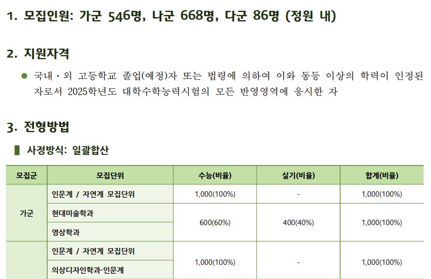 건국대학교는 가, 나, 다군에서 모두 학생을 모집하며, 예체능의 경우 실기고사를 시행합니다.