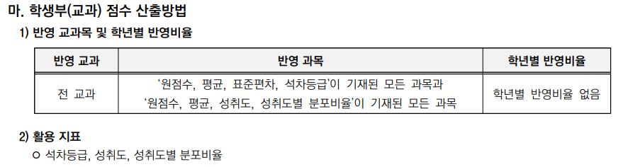 체육교육과는 학생부(교과) 점수를 산출할 때 국수영체 중 각 교과별 상위 3과목, 최대 12과목만을 반영합니다.