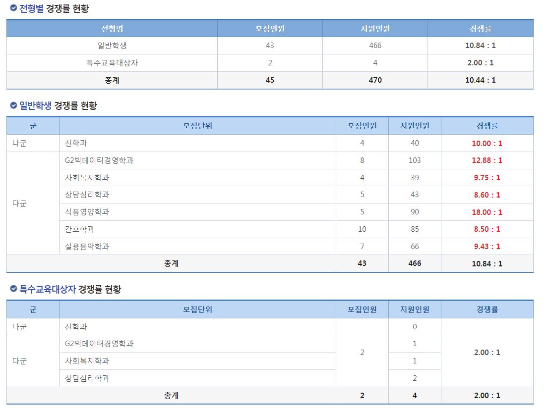일반학생 전형에서 가장 경쟁률이 높았던 학과는 식품영양학과(18.00:1), G2빅데이터경영학과(12.88:1), 신학과(10.00:1) 순이었습니다.