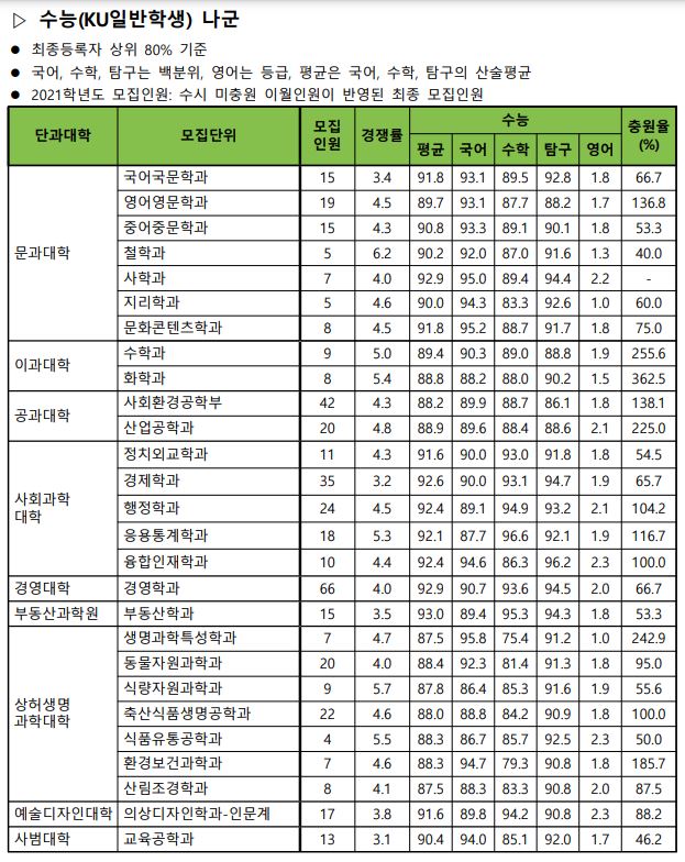 성적을 경쟁률, 최종등록자 70% 백분위 순으로 적자면 물리학과(4.9, 87.8), 건축학부(6.5, 88.1), 기계항공공학부(3.6, 88.7), 전기전자공학부(3.6, 89.9), 화학공학부(4.0, 89.6), 컴퓨터공학부(3.6, 90.4), 생물공학과(5.0, 89.6), 국제무역학과(5.4, 91.0), 글로벌비즈니스학과(5.3, 91.1), 기술경영학과(4.3, 92.8), 수의예과(4.4, 96.3), 일어교육과(7.0, 91.2), 수학교육과(4.8, 90.1), 영어교육과(5.1, 91.5), 국어국문학과(3.4, 91.8), 영어영문학과(4.5, 89.7), 중어중문학과(4.3, 90.8), 철학과(6.2, 90.2), 사학과(4.0, 92.9), 지리학과(4.6, 90.0), 문화콘텐츠학과(4.5, 91.8), 수학과(5.0, 89.4), 화학과(5.4, 88.8), 사회환경공학부(4.3, 88.2), 산업공학과(4.8, 88.9), 정치외교학과(4.3, 91.6), 경제학과(3.2, 92.6), 행정학과(4.5, 92.4), 응용통계학과(5.3, 92.1), 융합인재학과(4.4, 92.4), 경영학과(4.0, 92.9), 부동산학과(3.5, 93.0), 생명과학특성학과(4.7, 87.5), 동물자원과학과(4.0, 88.4), 식량자원과학과(5.7, 87.8), 축산식품생명공학과(46, 88.0), 식품유통공학과(5.5, 88.3), 환경보건과학과(4.6, 88.3), 산림조경학과(4.1, 87.5), 의상디자인학과-인문계(3.8, 91.6), 교육공학과(3.1, 90.4), 미디어커뮤니케이션학과(28.5, 93.7), 미래에너지공학과(11.7, 87.7), 스마트운행체공학과(11.2, 89.9), 스마트ICT융합공학과(12.8, 90.9), 화장품공학과(10.6, 90.1), 줄기세포재생공학과(26.0, 미공개(수시이월인원)), 의생명공학과(12.1, 90.1), 시스템생명공학과(12.1, 91.0), 융합생명공학과(11.8, 90.7)