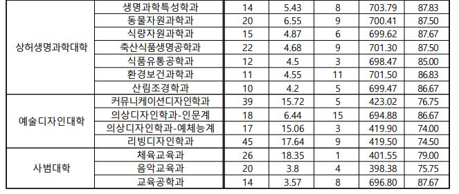 성적을 경쟁률, 최종등록자 70% 순으로 적자면 물리학과(7.92, 704.21), 건축학부(5.9, 702.12), 기계항공공학부(4.66, 706.09), 전기전자공학부(4.22, 709.64), 화학공학부(3.79, 707.23), 컴퓨터공학부(4.89, 710.85), 생물공학과(7.15, 705.95), 국제무역학과(5.57, 697.48), 글로벌비즈니스학과(695.46), 기술경영학과(5.35, 698.56), 수의예과(4.21, 737.53), 현대미술학과(6.09, 407.21), 영상영화학과(11.13, 416.78), 일어교육과(6.75, 696.01), 수학교육과(6.57, 707.03), 영어교육과(6.13, 695.89), 국어국문학과(5.64, 695.44), 영어영문학과(4.8, 695.79), 중어중문학과(5.38, 694.51), 철학과(8, 694.66), 사학과(6.13, 696.06), 지리학과(8.4, 695.15), 문화콘텐츠학과(5.1, 696.61), 수학과(5.13, 704.18), 화학과(4.45, 705.26), 사회환경공학부(4.29, 703.20), 산업공학과(5.36, 705.01), 정치외교학과(8.5, 696.34), 경제학과(4.81, 698.64), 행정학과(4.14, 697.66), 응용통계학과(3.76, 700.85), 융합인재학과(4.25, 697.40), 경영학과(4.63, 698.93), 부동산학과(4.47, 699.98), 미래에너지공학과(7.08, 705.13), 스마트운행체공학과(5.57, 706.28), 스마트ICT융합공학과(5.62, 707.13), 화장품공학과(5.17, 704.35), 생명과학특성학과(5.43, 703.79), 동물자원과학과(6.55, 700.41), 식량자원과학과(4.87, 699.62), 축산식품생명공학과(4.68, 701.30), 식품유통공학과(4.5, 698.47), 환경보건과학과(4.55, 701.50), 산림조경학과(4.2, 699.47), 커뮤니케이션디자인학과(15.72, 423.02), 의상디자인학과-인문계(6.44, 694.88), 의상디자인학과-예체능계(15.06, 419.90), 리빙디자인학과(17.64, 419.50), 체육교육과(18.35, 401.55), 음악교육과(3.8, 398.38), 교육공학과(3.57, 696.80), 미디어커뮤니케이션학과(39.44, 696.69), 줄기세포재생공학과(20.09, 705.84), 의생명공학과(21.40, 707.77), 시스템생명공학과(1.44, 706.44), 융합생명공학과(21.60, 708.42), 산업디자인학과(23.59, 436.09)