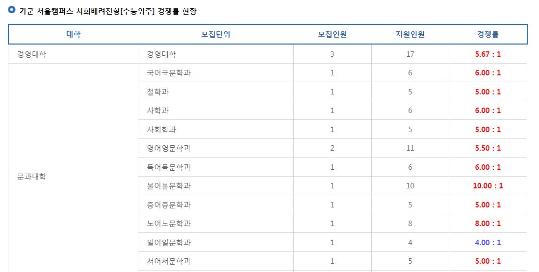 가군 서울캠퍼스 사회배려전형[수능위주] 경쟁률 현황