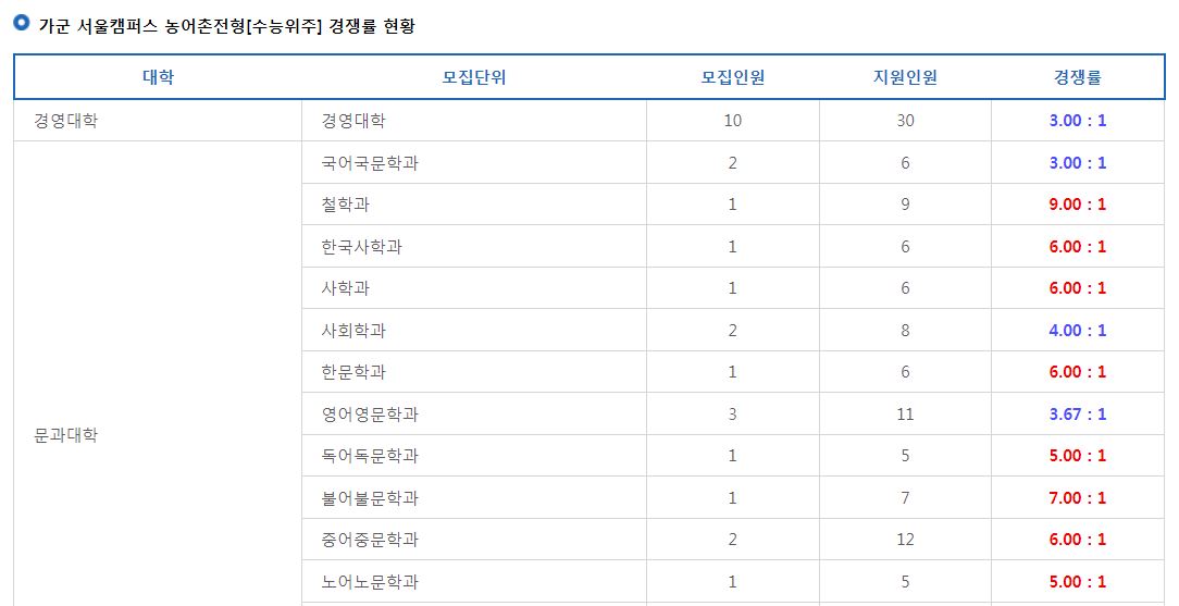 가군 서울캠퍼스 농어촌전형[수능위주] 경쟁률 현황