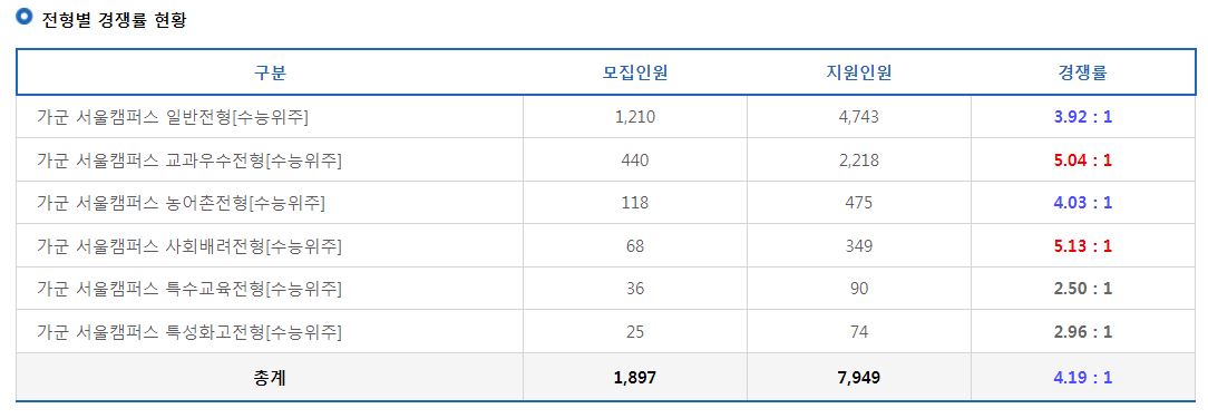 전형별 경쟁률 현황 먼저 살펴보겠습니다. 가장 경쟁률이 높았던 전형은 가군 서울캠퍼스 사회배려전형[수능위주](5.13:1), 가군 서울캠퍼스 교과우수전형[수능위주](5.04:1), 가군 서울캠퍼스 일반전형[수능위주](3.92:1) 순이었습니다.