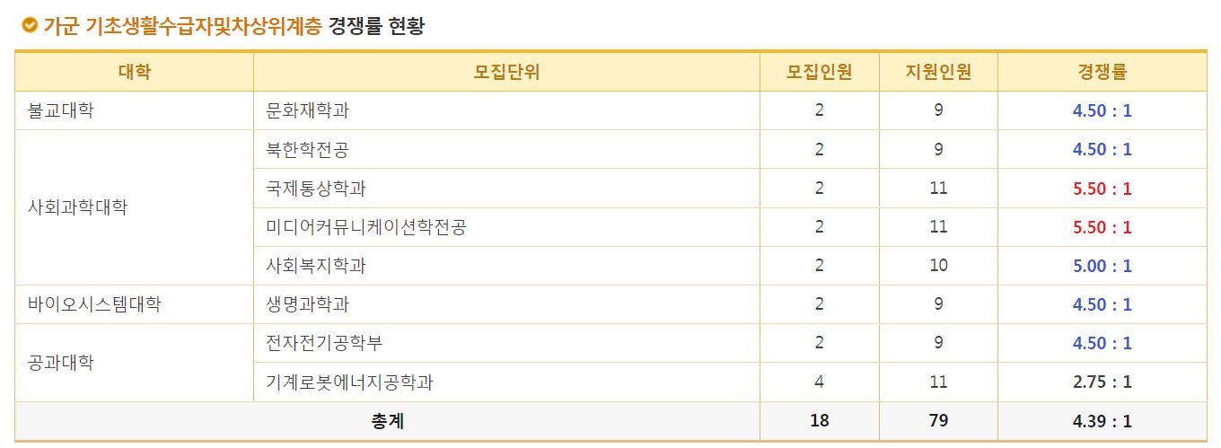 전형별로 살펴보자면, 올해 동국대학교에서 가장 경쟁률이 높았던 전형은 가군 특성화고등을졸업한재직자(13.40:1), 나군 기초생활수급자및차상위계층(6.48:1), 나군 특성화고교졸업자(6.17:1) 순이었습니다.