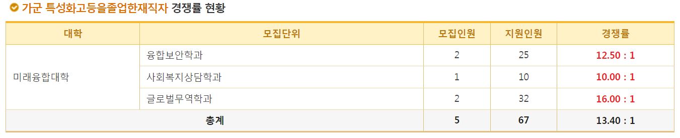가군 특성화고등을졸업한재직자 전형에서는 융합보안학과, 사회복지상담학과, 글로벌무역학과의 신입생을 모집했으며, 융합보안학과의 경쟁률은 12.50:1, 사회복지상담학과 10.00:1, 글로벌무역학과는 16.00:1 이었습니다.