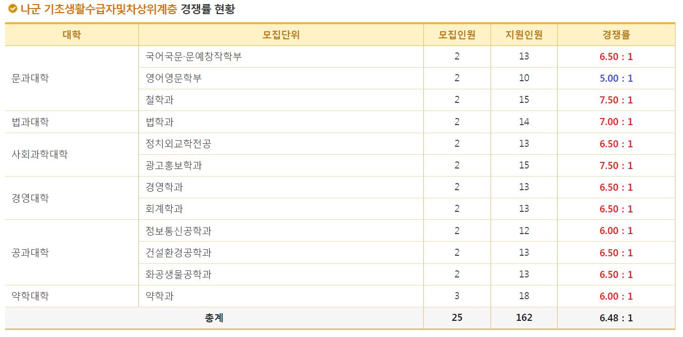 나군 기초생활수급자및차상위계층에서 가장 경쟁률이 높았던 학과는 광고홍보학과(7.50:1), 철학과(7.50:1), 법학과(7.00:1) 순이었습니다.
