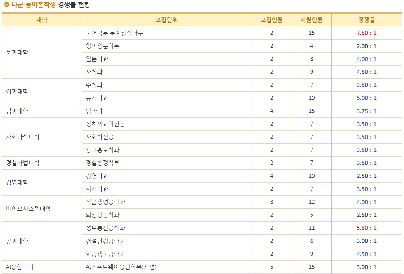 나군 농어촌학생 경쟁률 현황