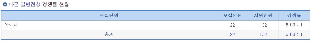 나군 일반전형에서는 약학과의 신입생을 모집했으며, 경쟁률은 6.00:1 이었습니다.