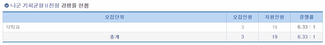 나군 기회균형2 전형에서는 약학과의 신입생을 모집했으며, 경쟁률은 6.33:1 이었습니다.