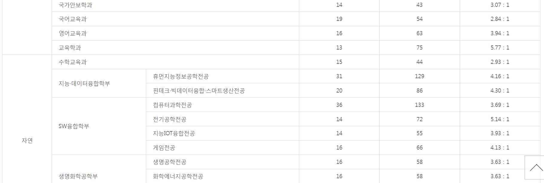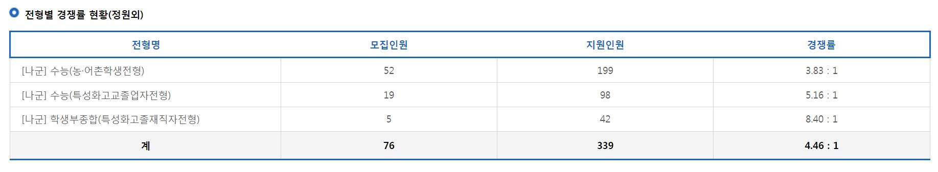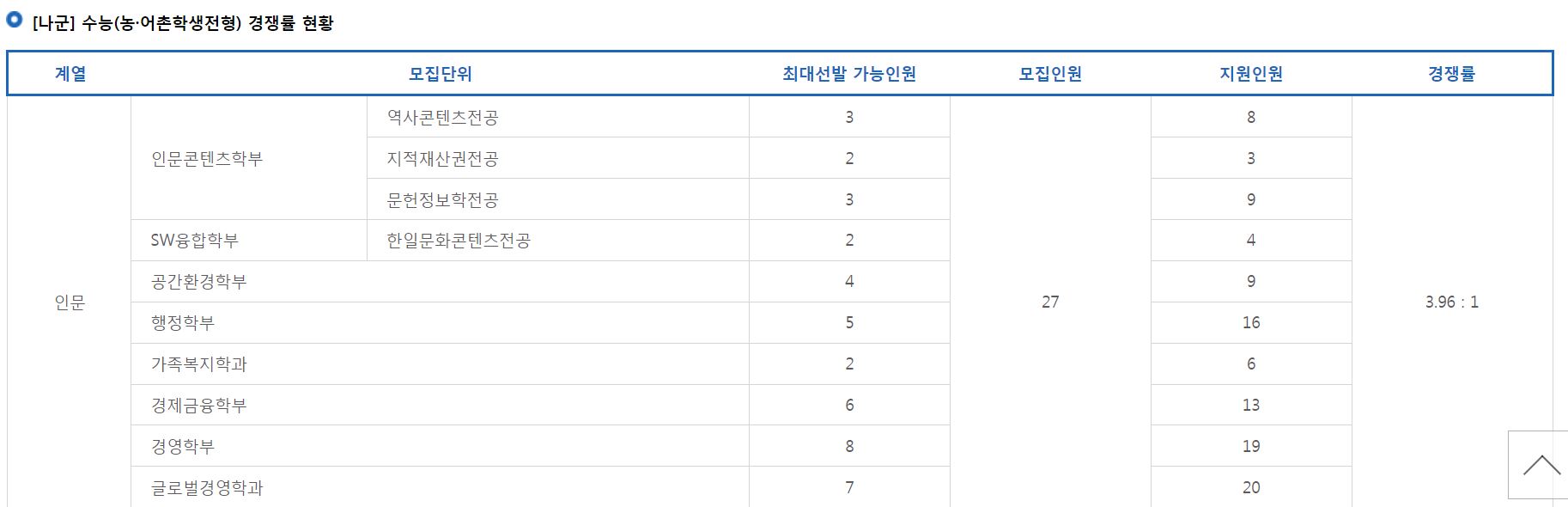 [나군] 수능(농어촌학생전형)은 인문학부, 자연학부&예체능을 각각 통합모집했으며, 인문의 경쟁률은 3.96:1, 자연&예체능의 경쟁률은 3.68:1 이었습니다.